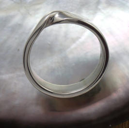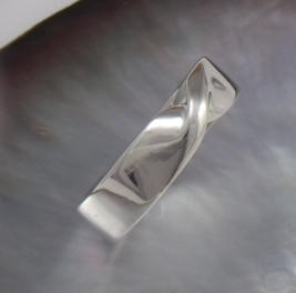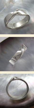 Each piece is hand formed to order in tarnish resistant sterling silver. They are made of 1.75 millimeter thick metal that is 5 millimeters wide. In the forming process the metal is twisted 180 degrees along its length. Then formed into a band shape so that the two ends can be joined seamlessly together. Select your size from the dropdown menu at the top of the page. Other metals can be used such as gold, please contact us for this special order. Contact us at email info@5oaksstudio.com for this special requests.