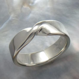 The Infinity Band is a natural extension of my exploration of the infinity ribbon used to form the structure of a piece of jewelry. It is not merely an application of a symbol onto a piece of jewelry, but rather the piece is formed from the infinity ribbon as represented by the Mobius strip. Each ring is hand wrought from a Mobius strip form. The ring is an unbroken circle representing something that is never ending. The wedding band is a deeply meaningful symbol of the eternal love and commitment of a couple to one another and is an outward symbol of their union. The Mobius strip though simple is an amazing thing. A model can easily be created by taking a paper strip and giving it a half-twist then joining the ends of the strip together to form a loop. It has only one side. What a curious thing. A line starting at any random point drawn down the middle length will meet the beginning of the line all without picking up the pen. The Mobius strip is often cited as the inspiration for the infinity symbol, since if one were to stand on the surface of a Mobius strip; one could walk along it forever. Some mathematicians may argue the point, but this is where I take artistic license. In combining the ring and an infinity ribbon a symbol of extraordinary meaning is created. This truly is an unbroken circle, an infinite band. There is no difference between the inside and the outside of the ring, they are one. What better way to represent your special union than with a band that has no beginning or no end. The infinite circle of life.